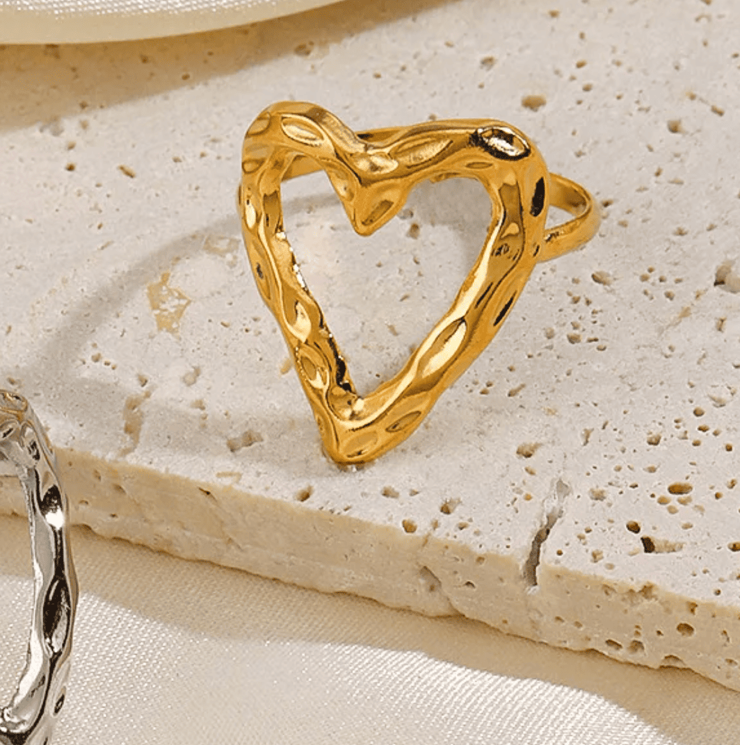 Affichez votre style unique avec cette bague cœur ouvert au design texturé, en acier inoxydable doré.