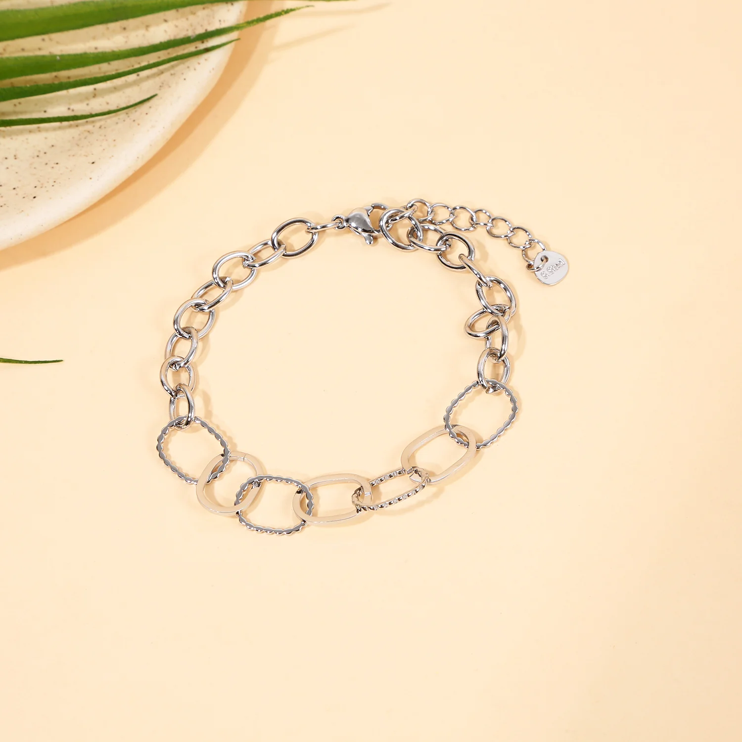 Ce bracelet moderne se distingue par son design original composé de maillons variés qui créent un jeu de formes élégant et tendance. Son style contemporain apporte du caractère tout en restant facile à porter au quotidien.