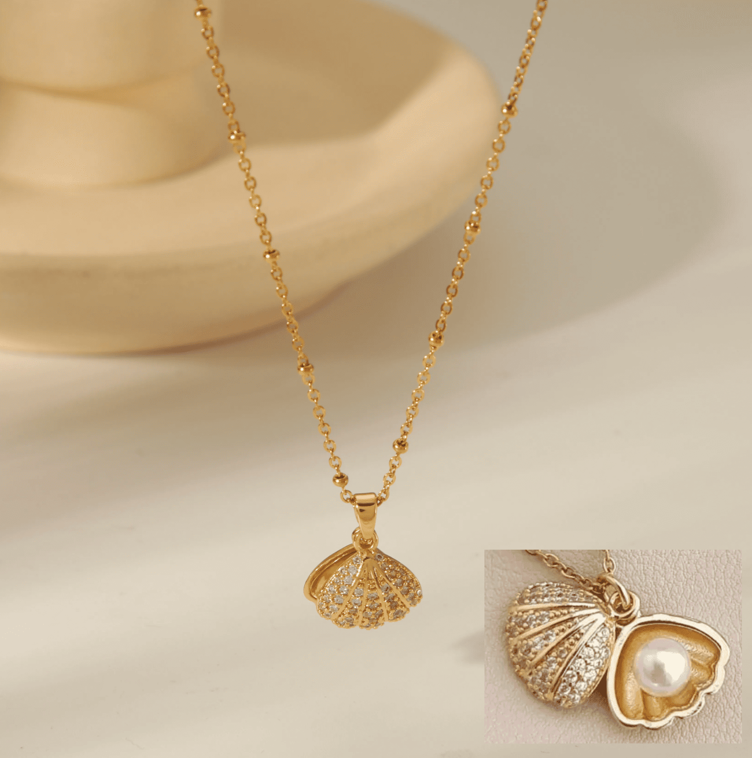 Ce collier en acier inoxydable doré séduit par son pendentif coquillage orné de strass.