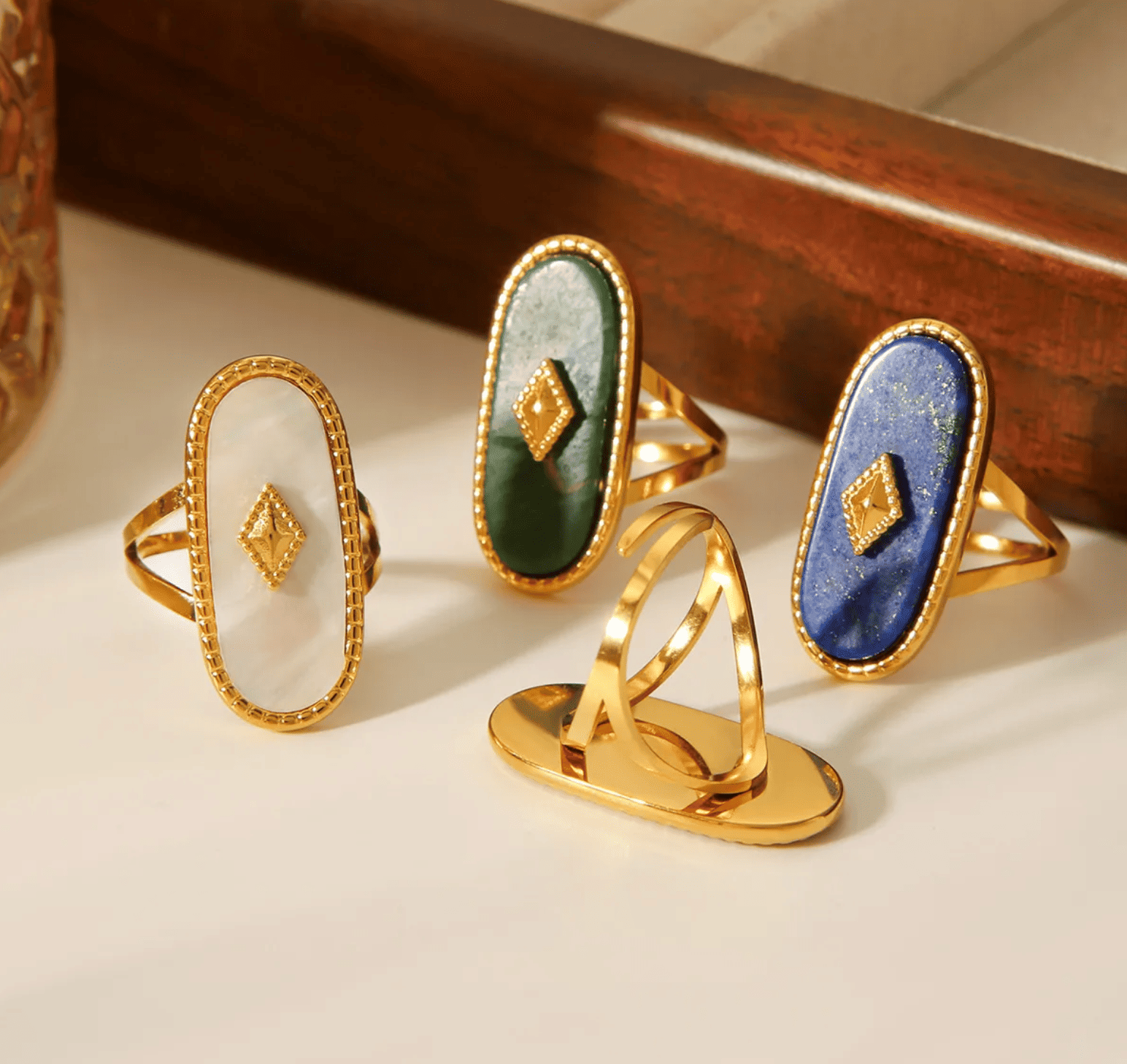 Des bagues élégantes et originales, ornées d’une pierre ovale colorée (blanc nacré, vert profond ou bleu nuit) avec un détail doré en losange au centre.