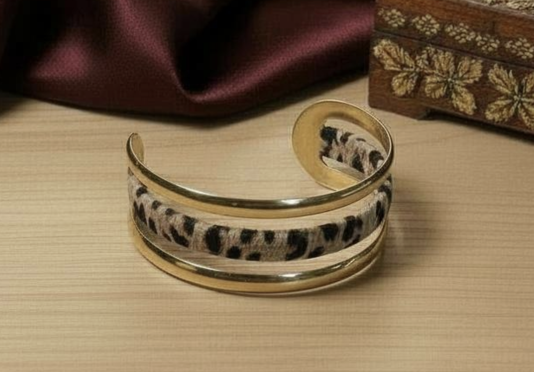 Cette manchette allie élégance et caractère grâce à son design doré structuré et sa bande textile motif léopard. Un bijou tendance qui apporte une touche sauvage et raffinée à n’importe quelle tenue.