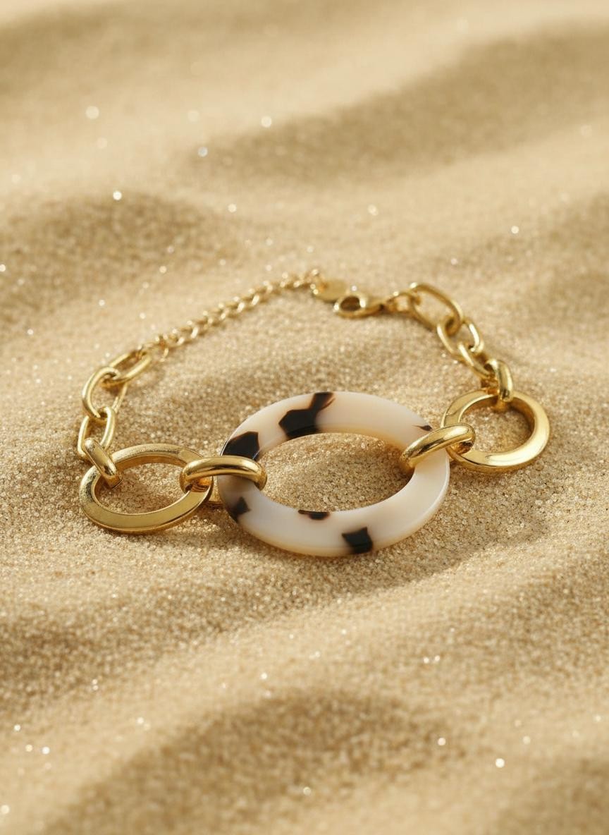 Inspiré des nuances chaudes du sable et des textures naturelles, ce bracelet doré met en valeur un anneau central effet écaille, parfaitement associé à de grandes mailles dorées. Un bijou moderne et solaire, idéal pour sublimer tous les looks d’été.