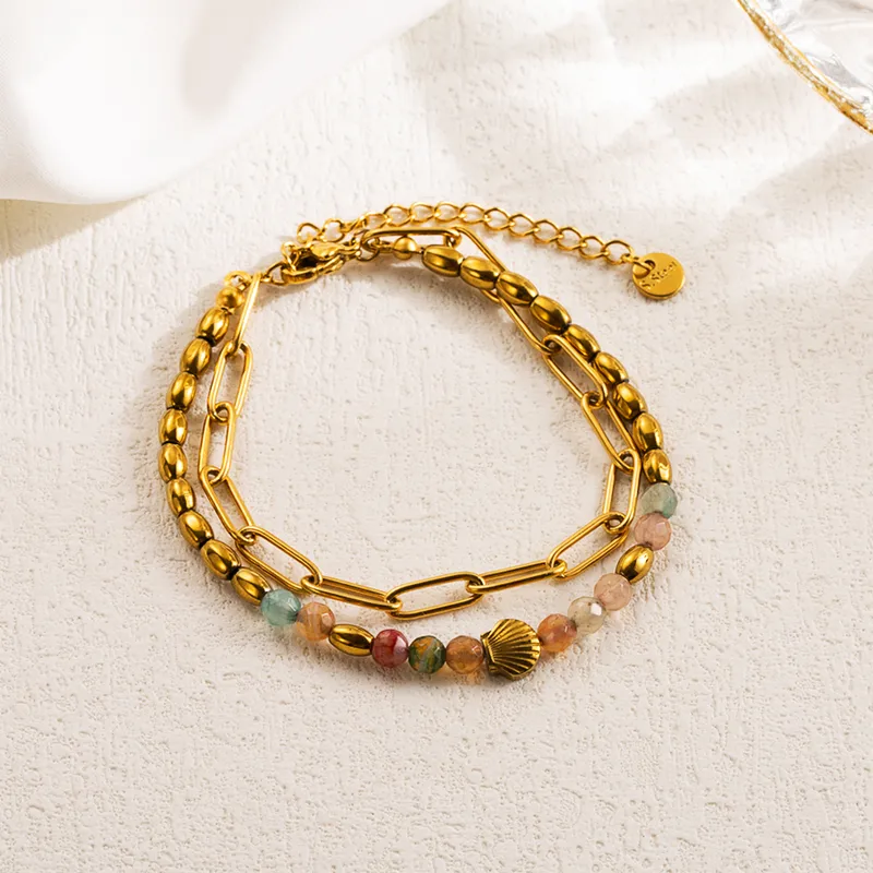 Ce bracelet raffiné capture l’esprit de l’été avec son mélange harmonieux de mailles dorées et de perles naturelles multicolores.