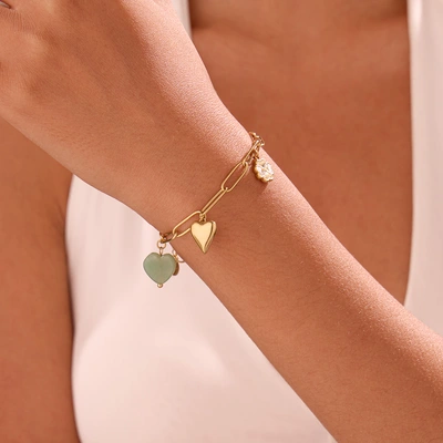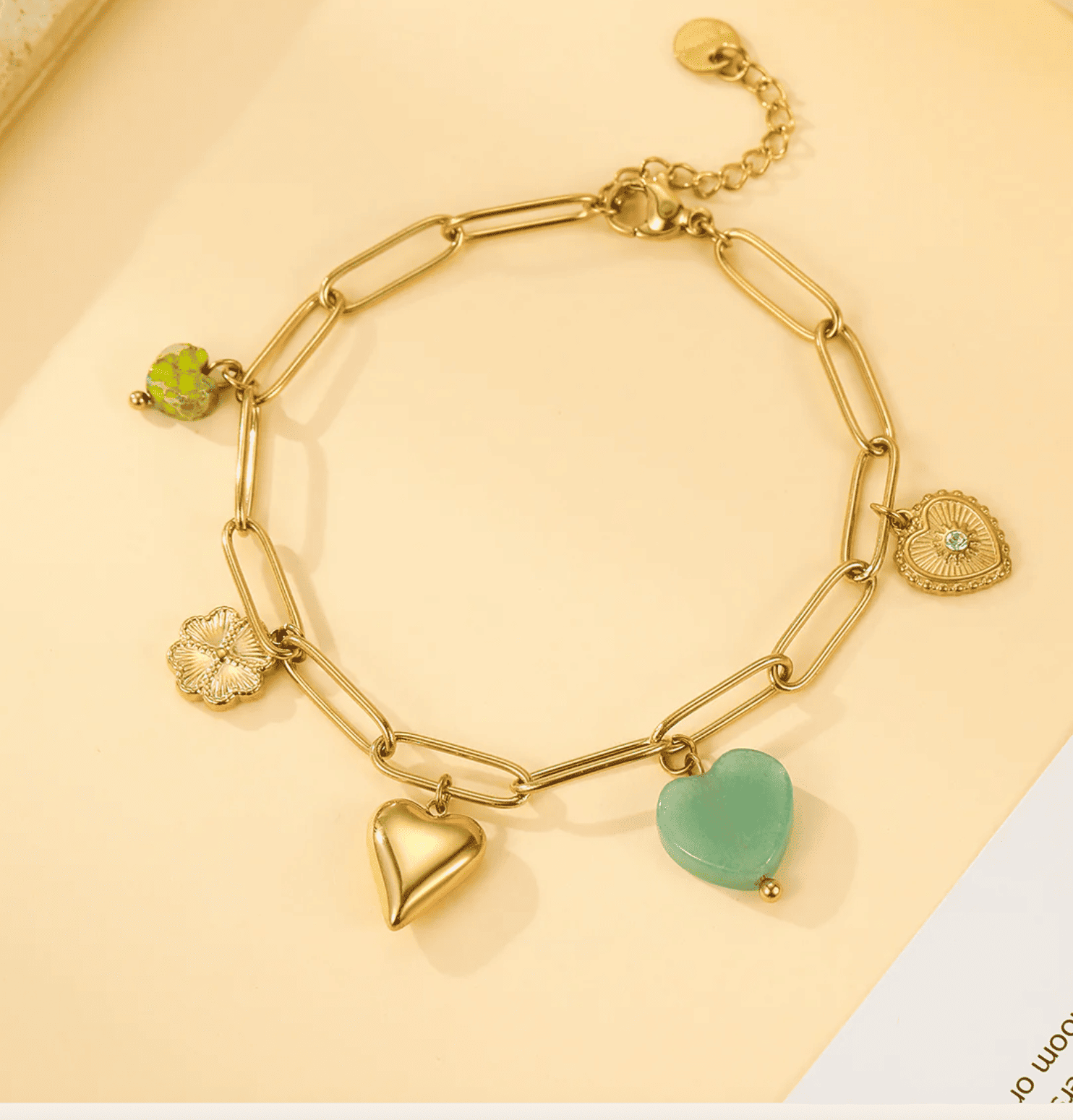Un bracelet moderne décoré de charms colorés et symboliques : cœur doré, cœur vert, trèfle, fleur et médaillon finement travaillé.