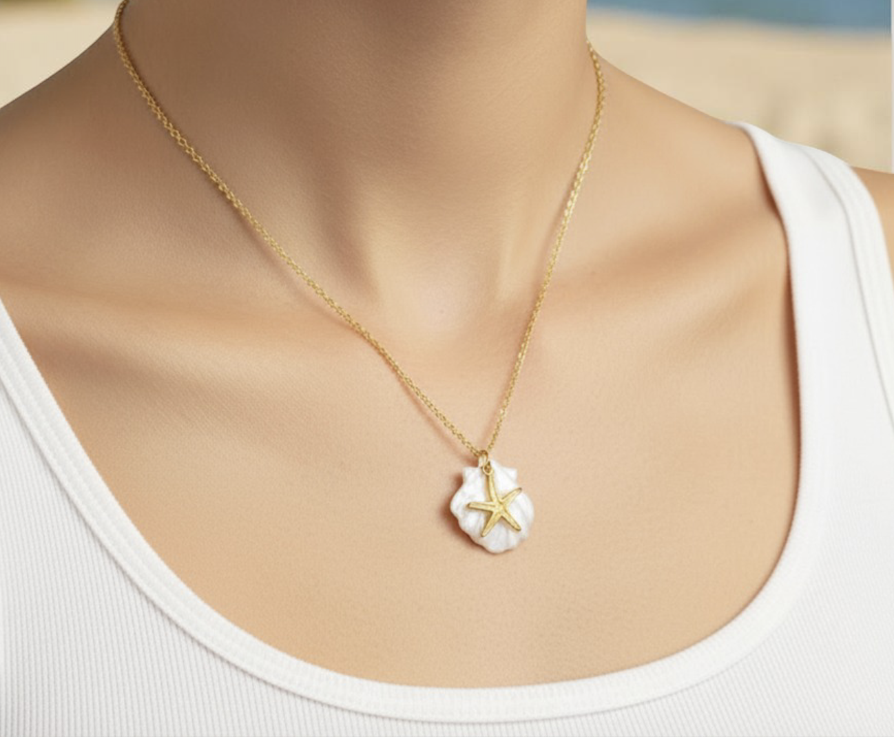 Ce collier doré met en valeur un pendentif en nacré, orné d’une étoile de mer dorée délicatement posée au centre. Un mélange raffiné entre élégance marine et esprit bohème.