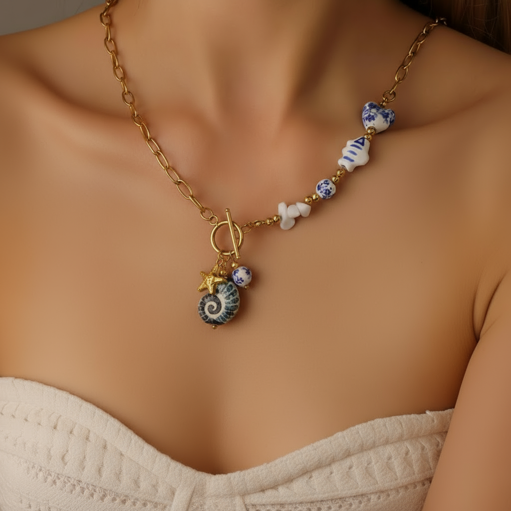Un collier doré raffiné orné d’un pendentif nautile, d’une étoile de mer dorée et de perles en céramique bleue et blanche au style artisanal.