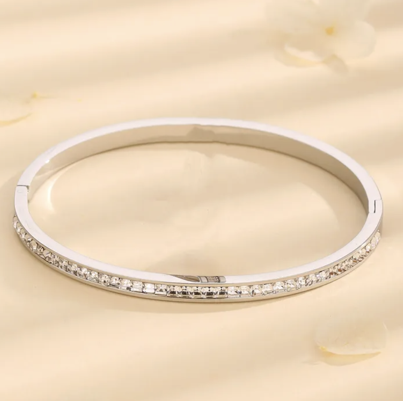 Ce bracelet en acier inoxydable argenté séduit par sa ligne fine et raffinée, sublimée de strass étincelants.