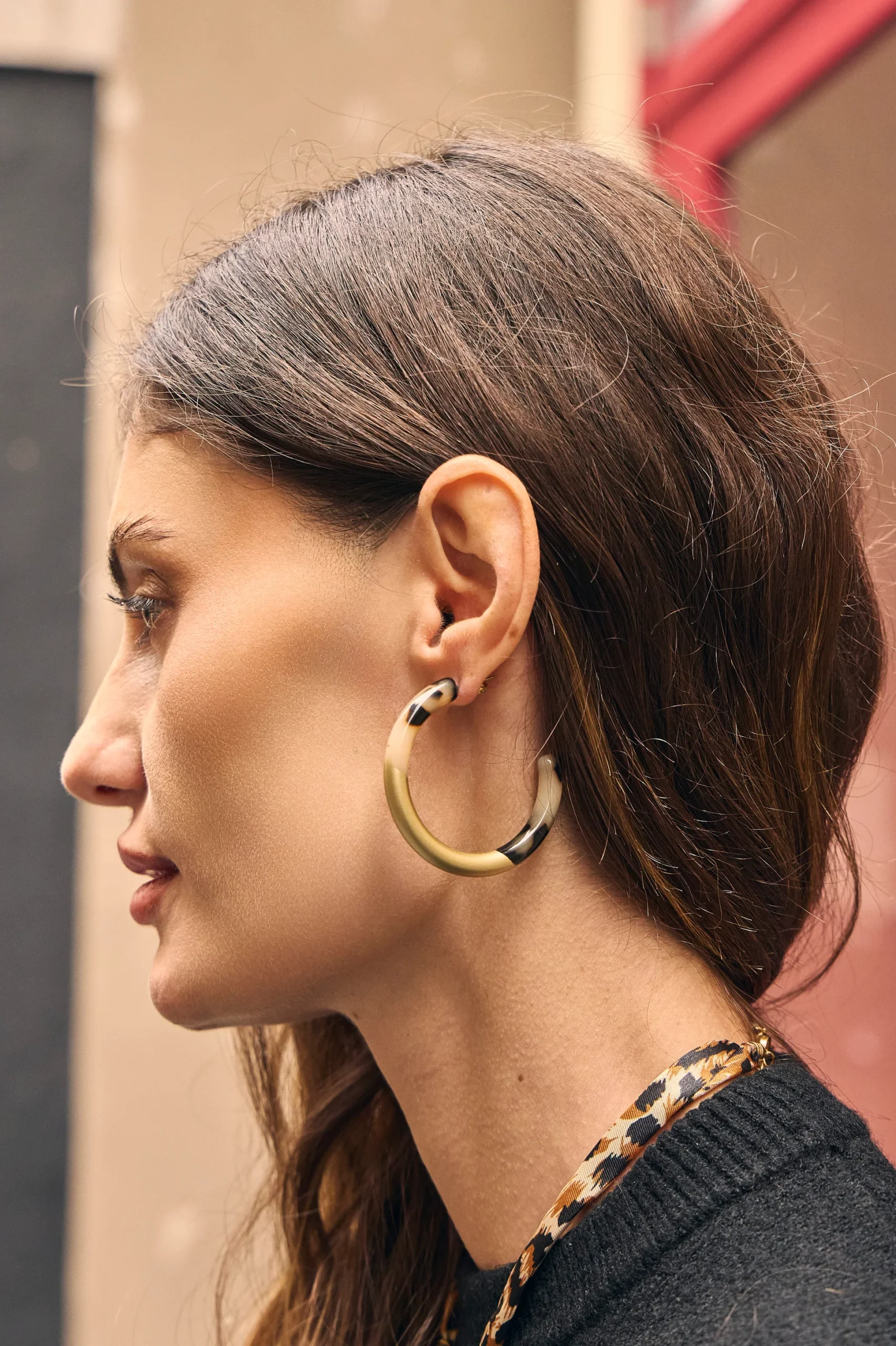 Ces boucles d’oreilles modernes séduisent par leur design unique mêlant effet écaille et finition dorée mate. Leur forme arrondie apporte une touche tendance tandis que le contraste des matières crée un style audacieux et raffiné.
